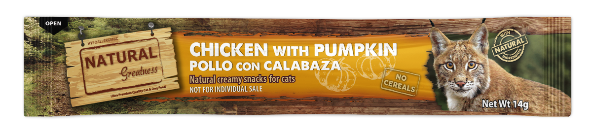 Natural Greatness Huhn mit Kürbiscreme ist ein weicher und cremiger Snack, der ohne Getreide aus hochwertigem Hühnerfleisch und natürlichen Zutaten wie Kürbis hergestellt wird und mit Taurin und Fructooligosacchariden angereichert ist, Präbiotika, die sehr vorteilhaft für die Erhaltung einer guten Verdauungsgesundheit sind.