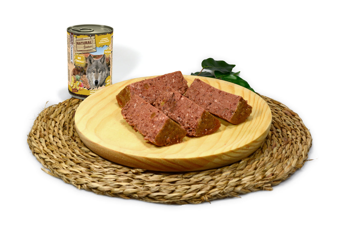 Die Rezeptur „Känguru mit Ananas, Mango und Spirulina“ enthält als einzige Proteinquelle Kängurufleisch. Kängurufleisch ist fettarm, proteinreich und enthält zudem viele Vitamine und Mineralstoffe. Kängurus fressen eine Vielzahl von Wildkräutern, Sträuchern und Bäumen, und aufgrund dieser Vielfalt enthält ihr Fleisch ein breites Spektrum an Makro- und Mikronährstoffen.