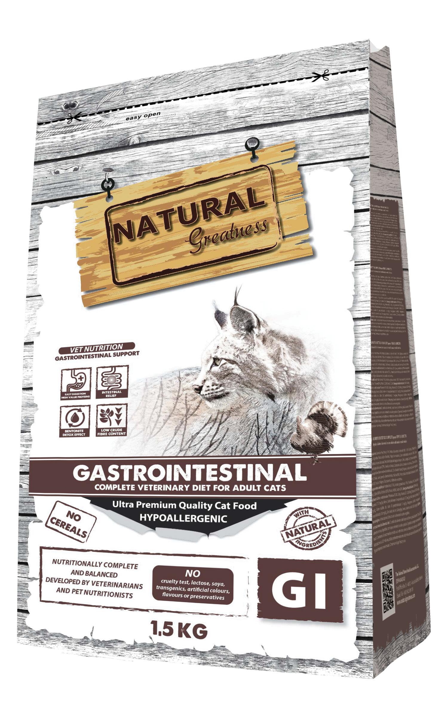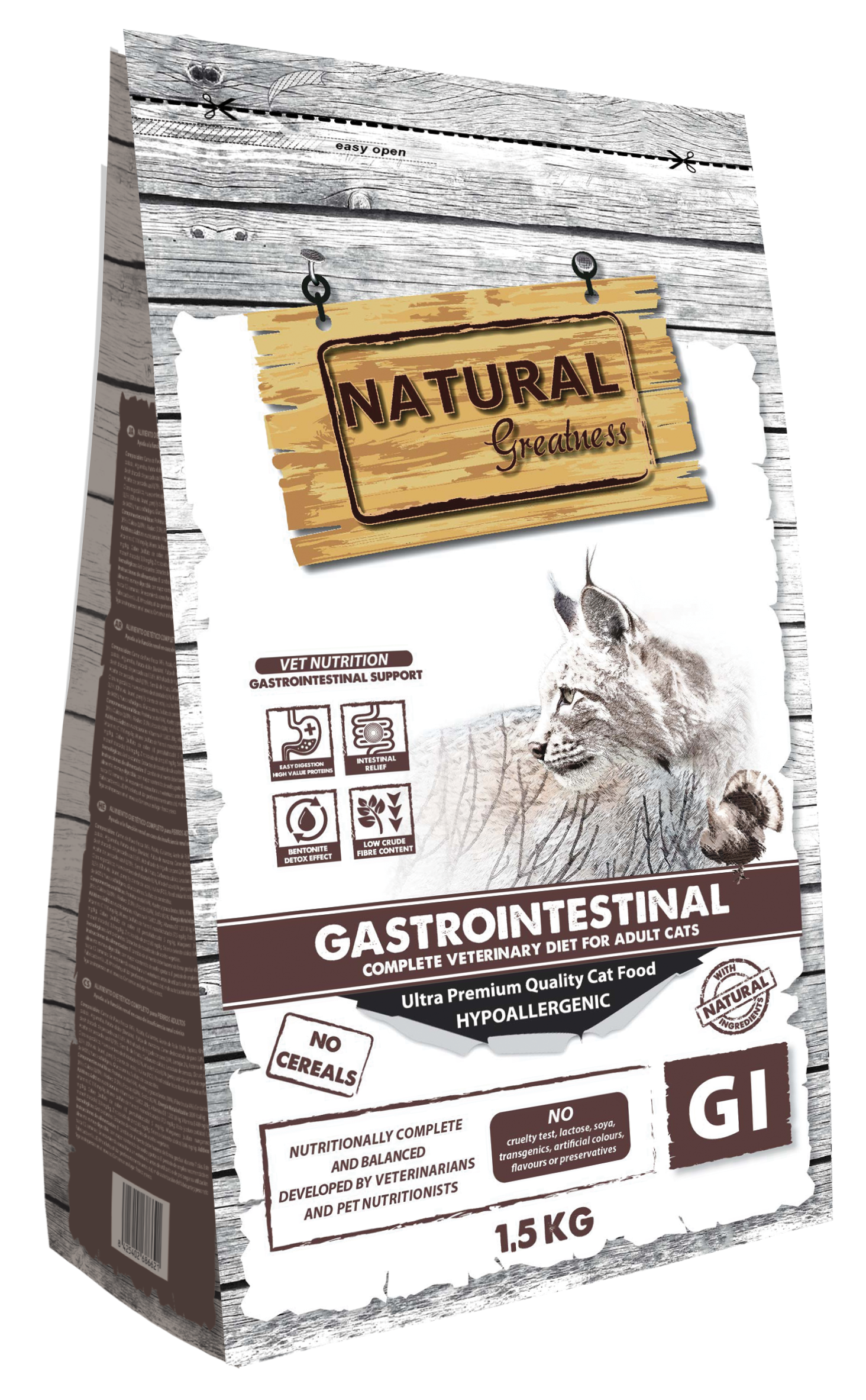 Natural Greatness Gastrointestinal ist ein vollständiges, getreidefreies, hypoallergenes Rezeptfuttermittel für ausgewachsene Katzen mit Darmresorptionsstörungen. Es enthält FOS- und MOS-Präbiotika zur Verbesserung der Nährstoffaufnahme, eine hohe Verdaulichkeit durch einen erhöhten Natrium- und Kaliumgehalt sowie Proteine tierischen Ursprungs mit hoher biologischer Wertigkeit.