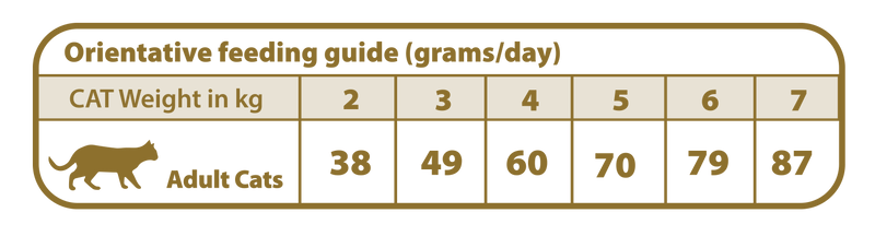 Frisches Hühnerfleisch (30 %), dehydriertes Puten- und Hühnerfleisch (14 %), Kartoffeln, Hühneröl (12 %), dehydrierter Lachs (10 %), Erbsen, Tapioka, Erbsenprotein, Apfelmark, hydrolysierte Puten- und Hühnerleber (3 %), Leinsamen, Rübenmark, Bierhefe, Lachsöl (0,4 %), gemischte Früchte (0,3 %) (Heidelbeere, Pflaume und Zitrusfrüchte), Gemüsemischung (0. 3%) (Nepeta cataria 500 mg/kg, Tee, Brombeere und Thymian), getrocknetes Vollei, Zichorie, Malzextrakt, Inulin (Quelle für FOS), hydrolysierte Hefezellwand (Quelle für MOS), hydrolysiertes Milcheiweiß, Glucosamin 700 mg/kg, Chondroitinsulfat 300 mg/kg, Kurkuma, Bockshornklee, Ingwer und Kaliumchlorid Verwertbare Energie: 4220 kcal/kg